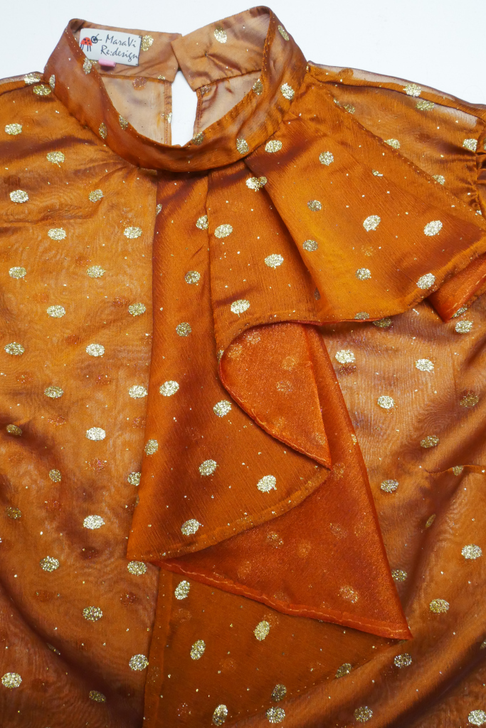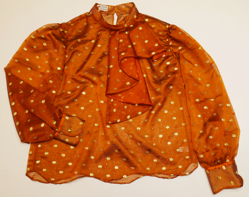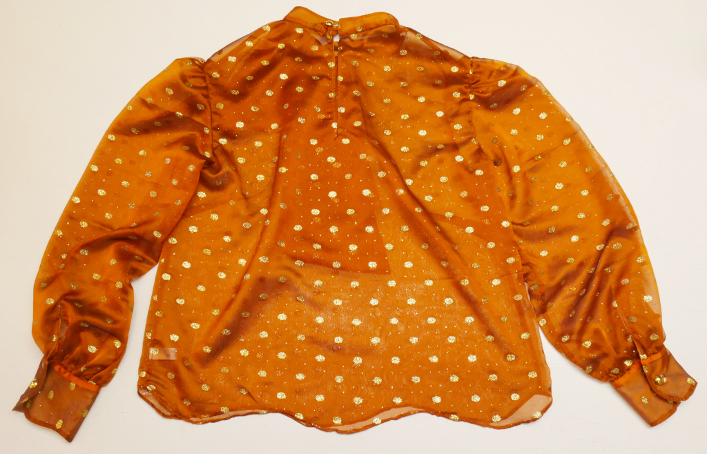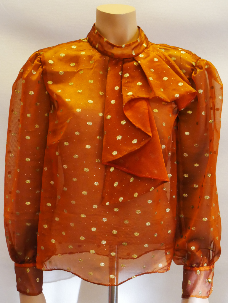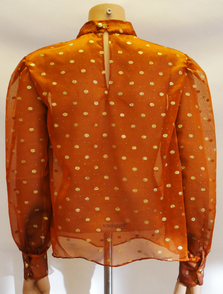 Blus av roströd krinklad chiffon med mönster av tryckta prickar av akrylglitter. Rynkad lång puffärm och rynkavslut vid vågkantad manschett med guldfärgade knappar i akryl. Ståkrage med veckat krås fram, som är fodrat med rostfärgad organza och knappsprund bak som knäpps med guldfärgad knapp i akryl. Vågformad handfållad nederkant. Krage, manschett och krås har handsydd pricksöm. Chiffon och organza, båda av 100% polyester. Tvättas i maskin, normaltvätt, 30 grader. Ej torktumling.