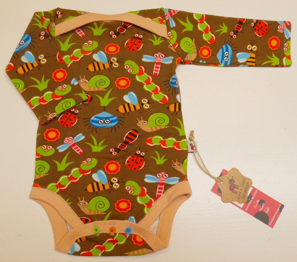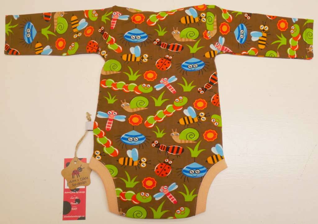 Långärmad babybody i brun slät trikå med multifärgat naivt insektsmönster och med ljusbeige patentstickad mudd runt ben- och halsringning. Knäppning i grenen med en blå, en grön och en orange knapp av akryl. Kvalité i all textil 100% bomull. Tvättas i 40 grader normaltvätt i maskin, ej torktumling.