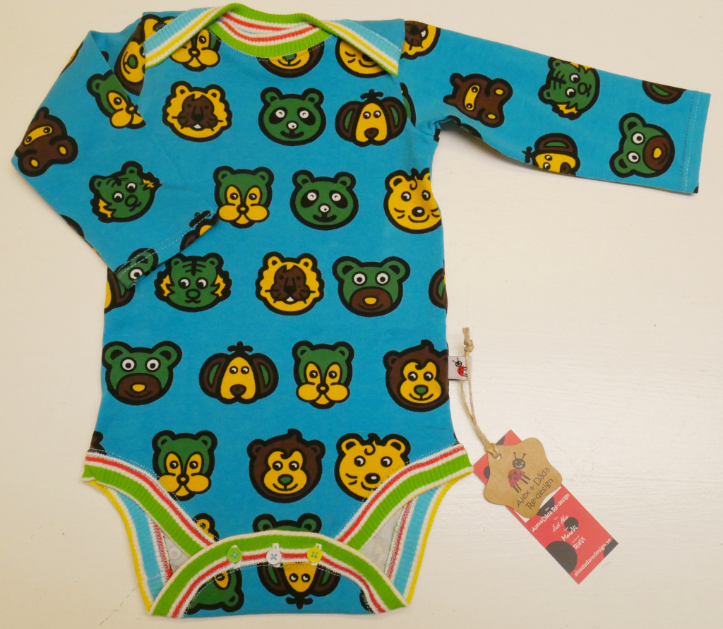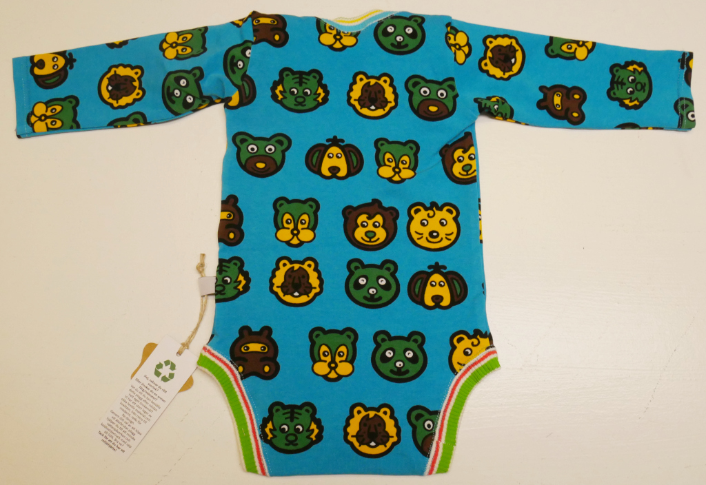Långärmad babybody i turkos slät trikå med naivt djurhuvudsmönster i färgerna grönt/gult/svart/brunt och vitt och med bredrandig ribbstickad mudd i färgerna vitt/rött/turkost/grönt och gult runt ben- och halsringning i 100% bomull. Knäppning i grenen med en gul, en vit och en grön knapp av akryl. Kvalité i trikåtextilen 97% bomull och 3% elastan. Tvättas i 40 grader normaltvätt i maskin, ej torktumling.