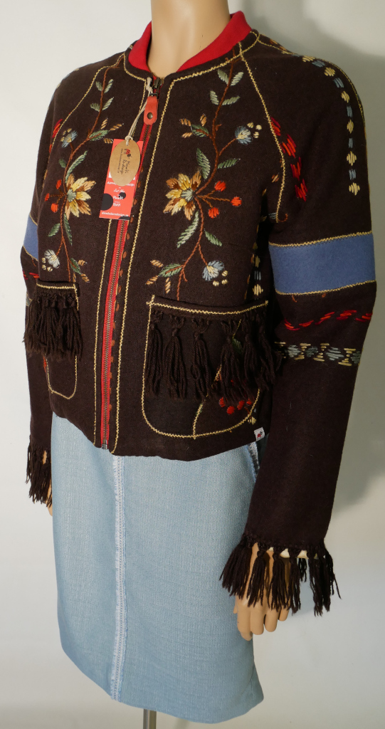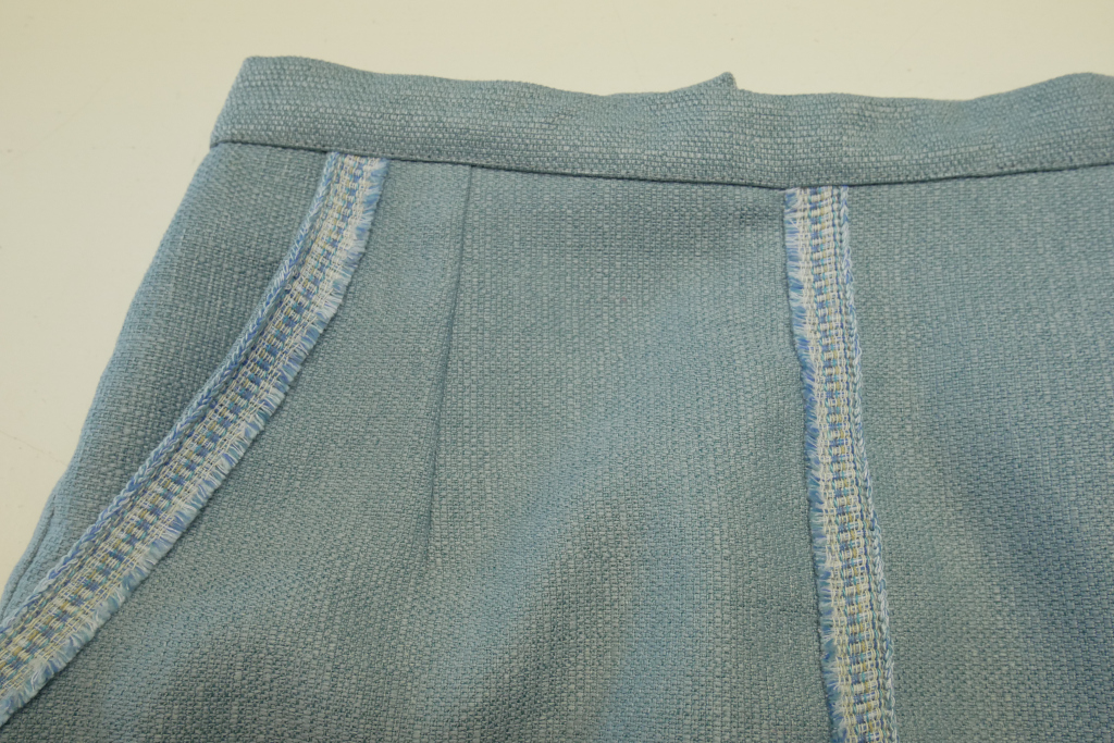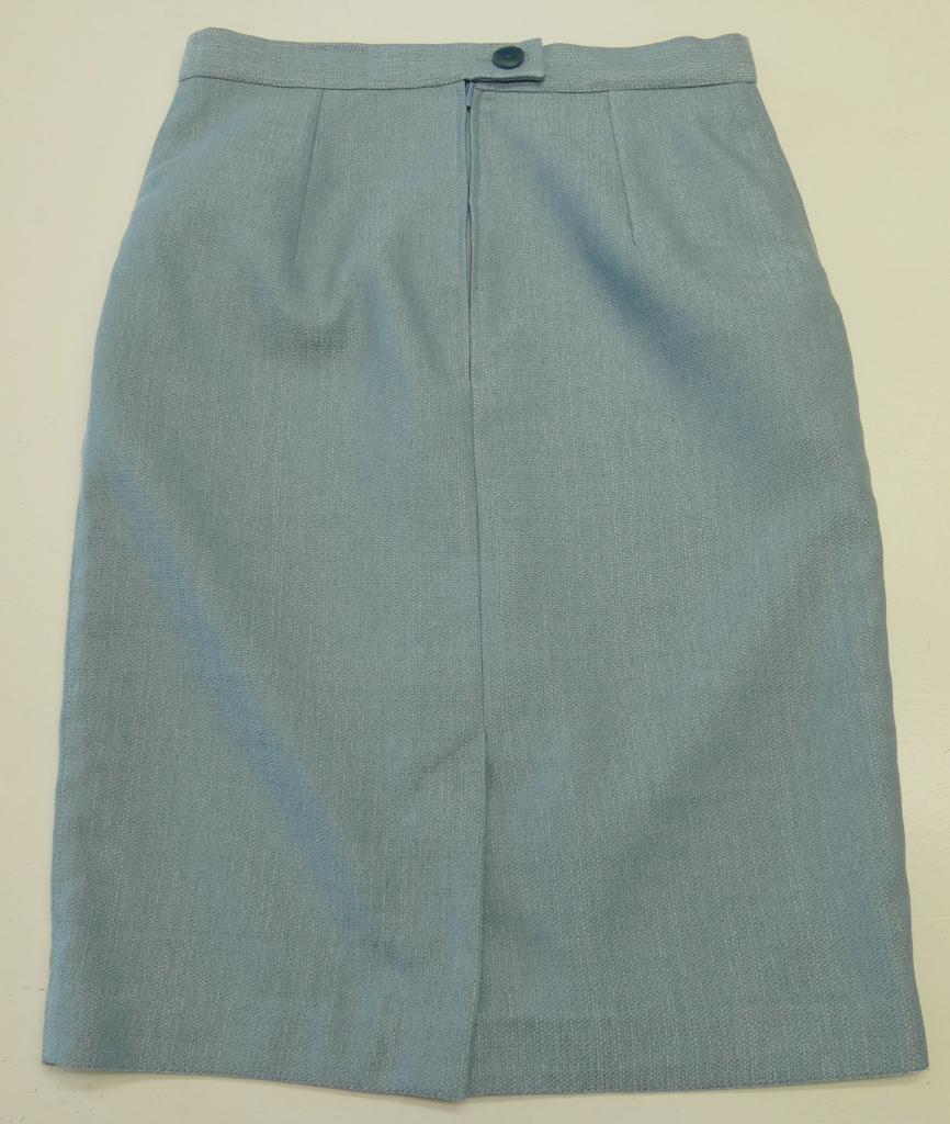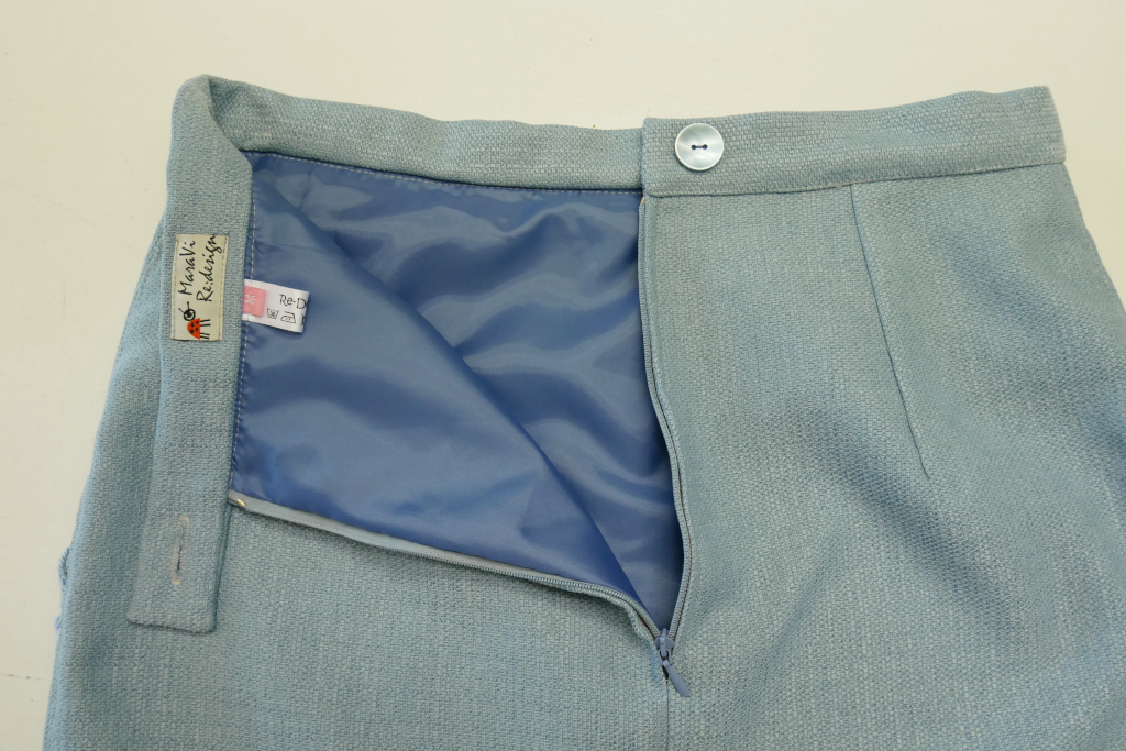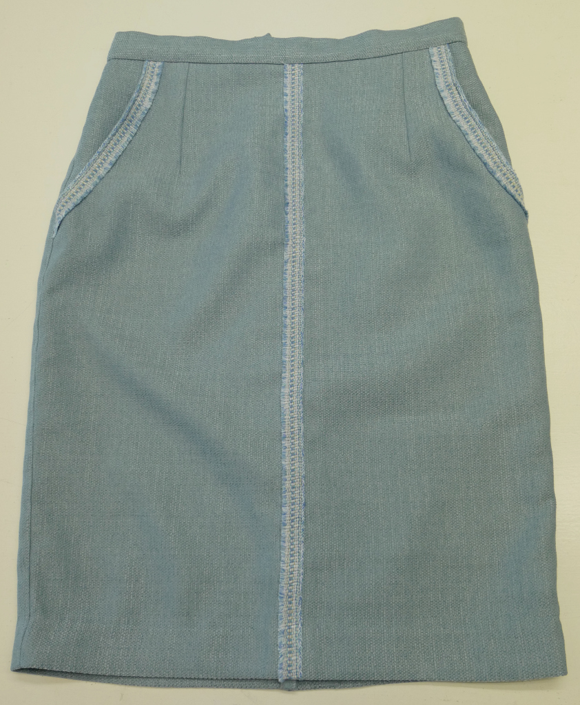 Fodrad pennkjol, i en blågrå nyans med dekorationsband, längd ca 63 cm med linning, två sidfickor, sprund och blixtlås bak. Återbrukad stuvbit från möbeltextil, 100% polyester. Blått foder av återbrukad gardinlängd, 100% acetat. Metallblixtlås och blå knapp av akryl. Tvättas i 40 grader normaltvätt i maskin. Ej torktumling.