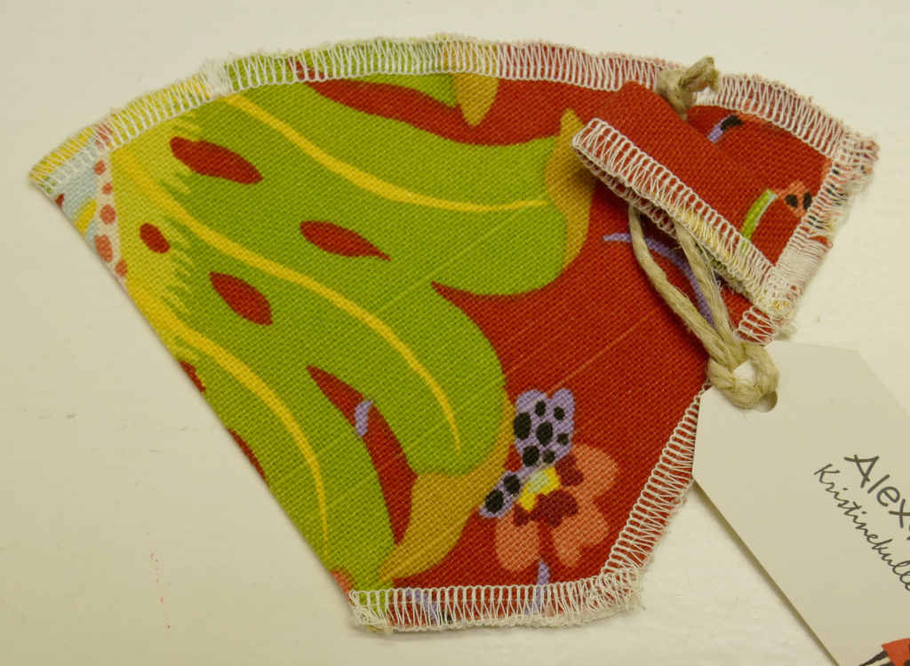 Kaffefilter stl 1x2 av återbrukad möbelkretong i rött med blommönster i 100% bomull. Praktisk hälla i samma textil för upphängning. Skötsel: Lägg sumpen i komposten efter användning, skölj ur filtret och häng upp på tork. Tvättas var fjärde till sjätte vecka genom att koka i rent vatten ca 10 min, hänges därefter upp på tork.