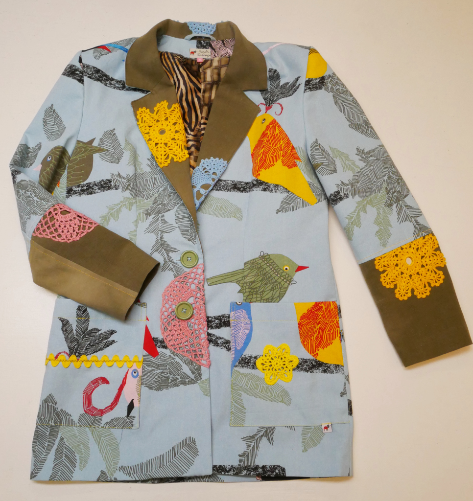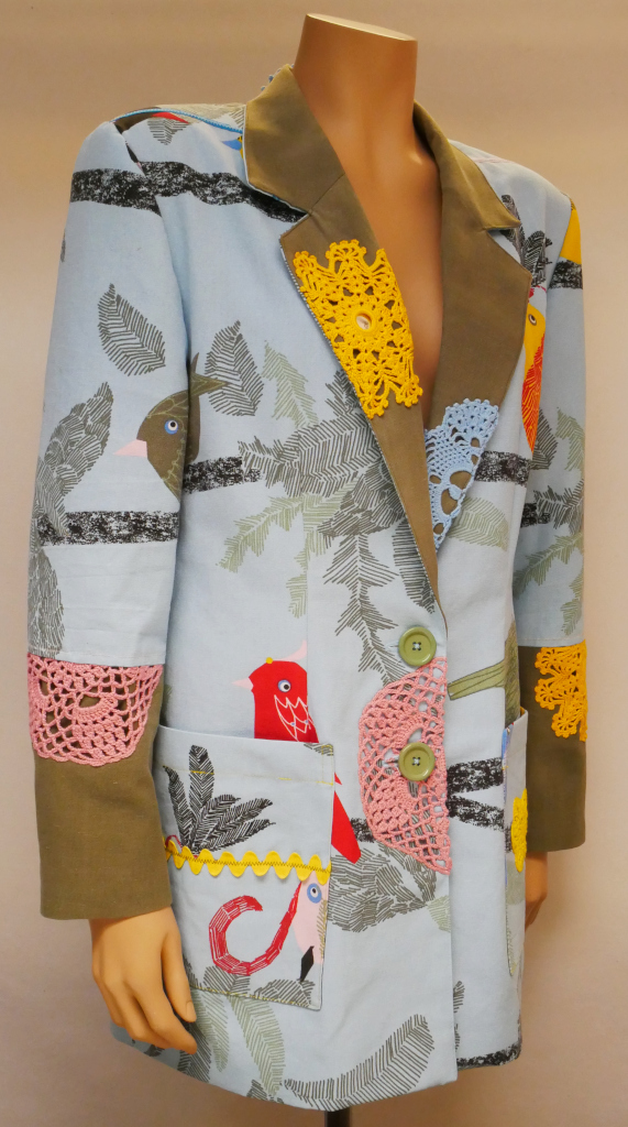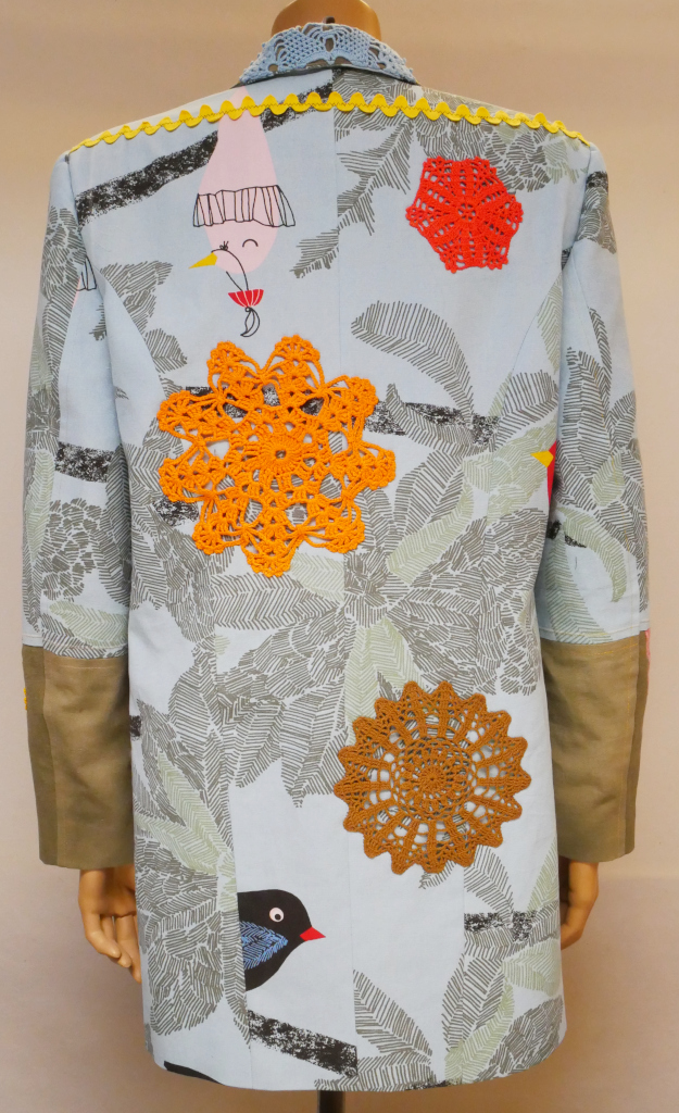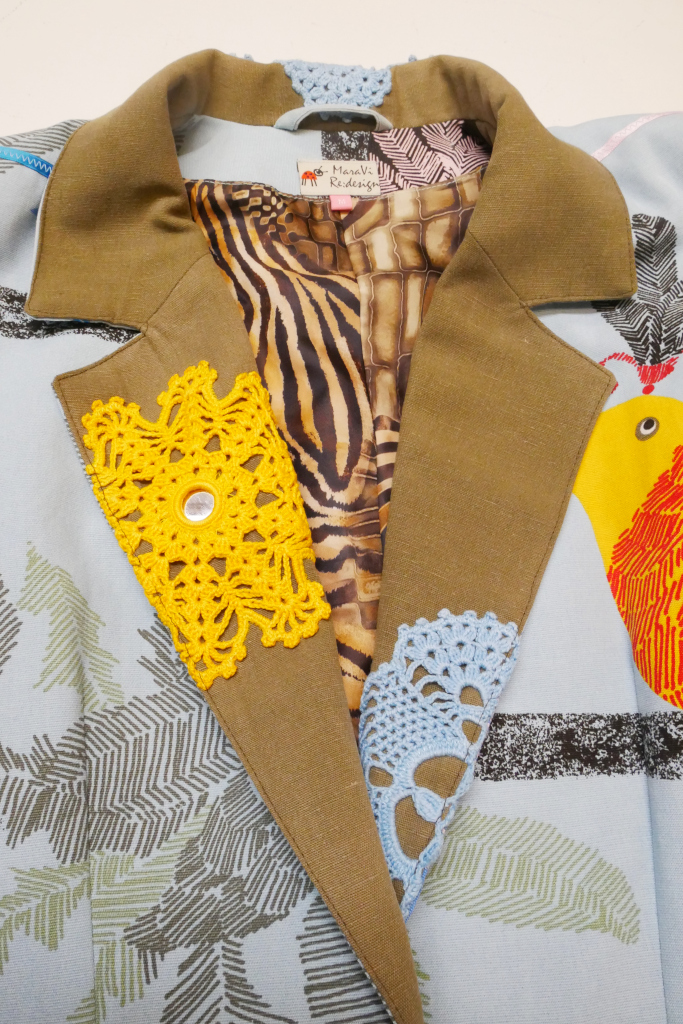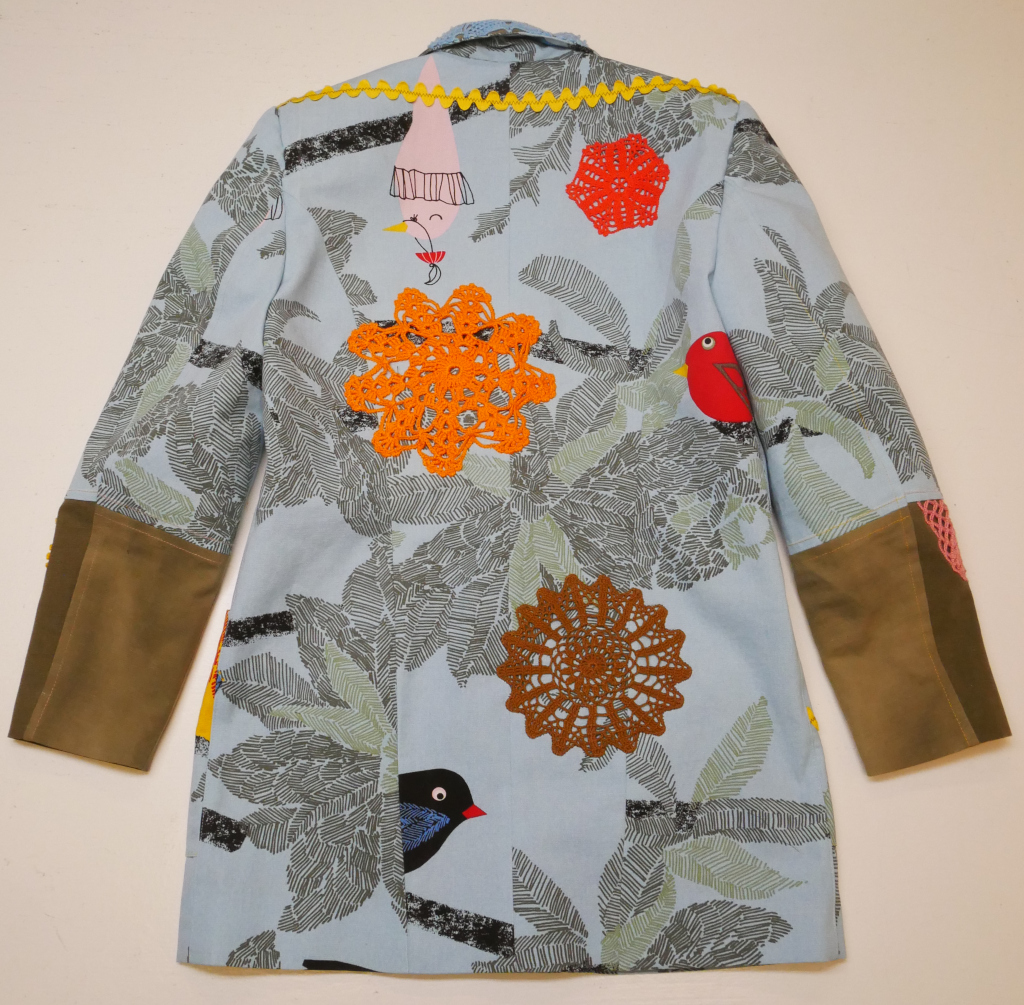 Längre kavaj i oversizemodell, multifärgat fantasimönster med fåglar och palmträd på ljus turkos botten av en återbrukad gardinkappa, 100% bomull och detaljer på ärmar och kavajslag av khakifärgad canvas, 100% bomull. Två utanpå fickor, en innerficka, dekorationer av zigzag-band och små färglada virkade dukar, (100% bomull), varav två med inlagda shishaspeglar. Återbrukat djurmönstrat foder i färgtema brunt/beiget- och svart, 100% acetat. Knäpps med två gröna knappar av akryl. Tunna axelvaddar, (återbrukade), för formens skull, 100% polyester. Tvättas i 40 grader normaltvätt i maskin. Tvätta också gärna med liknande färger. Ej torktumling.