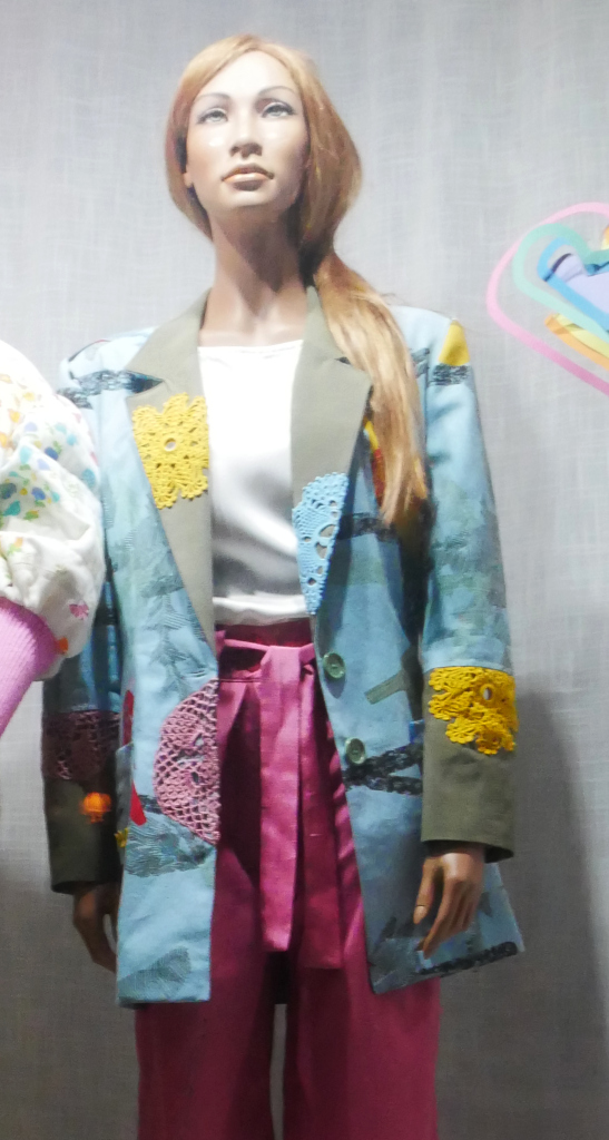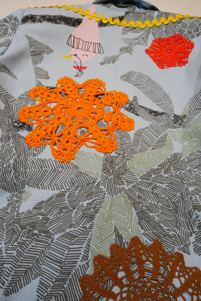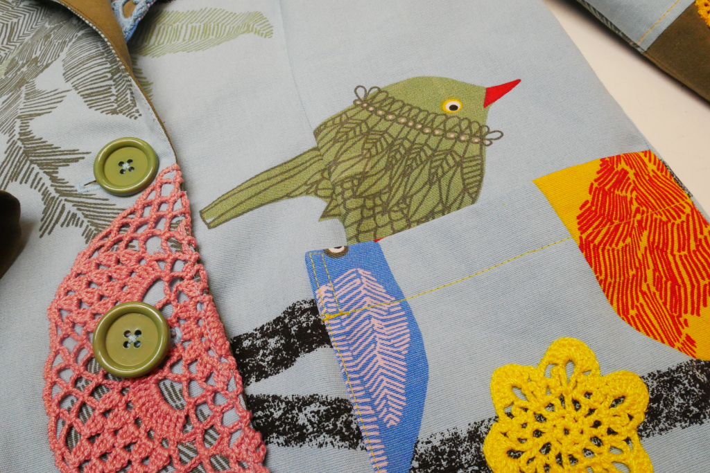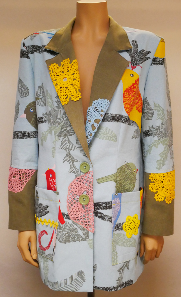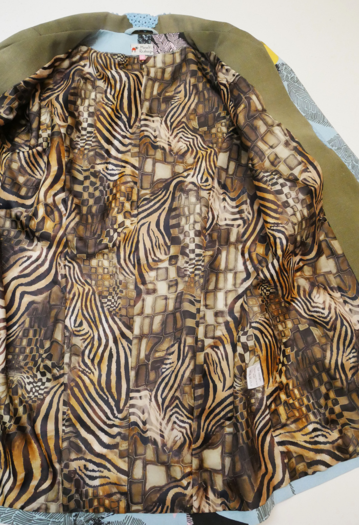 Längre kavaj i oversizemodell, multifärgat fantasimönster med fåglar och palmträd på ljus turkos botten av en återbrukad gardinkappa, 100% bomull och detaljer på ärmar och kavajslag av khakifärgad canvas, 100% bomull. Två utanpå fickor, en innerficka, dekorationer av zigzag-band och små färglada virkade dukar, (100% bomull), varav två med inlagda shishaspeglar. Återbrukat djurmönstrat foder i färgtema brunt/beiget- och svart, 100% acetat. Knäpps med två gröna knappar av akryl. Tunna axelvaddar, (återbrukade), för formens skull, 100% polyester. Tvättas i 40 grader normaltvätt i maskin. Tvätta också gärna med liknande färger. Ej torktumling.