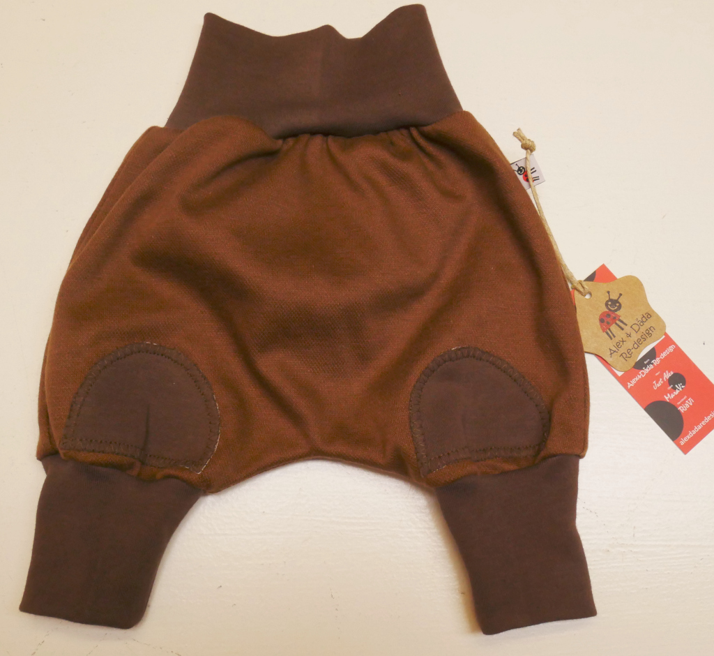 Rumpmonster, mjukisbyxa med knäpatchar fram och monsterapplikation bak av återbrukad slät brun college av 100% bomull. Återbrukad brun ribbstickad trikåmudd runt benslut, midja och som knäpatch av 100% bomull. Monsterapplikation av 100% bomull och röd tunga av WCT 100% polyester. Tvättas i 40 grader normaltvätt i maskin, ej torktumling.