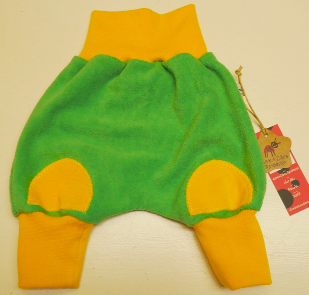 Rumpmonster, mjukisbyxa med knäpatchar fram och monsterapplikation bak av återbrukad grön plysch i 100% bomull. Återbrukad gul ribbstickad trikåmudd runt benslut, midja och som knäpatch av 100% bomull. Monsterapplikation av 100% bomull och röd tunga av WCT 100% polyester. Tvättas i 40 grader normaltvätt i maskin, ej torktumling.