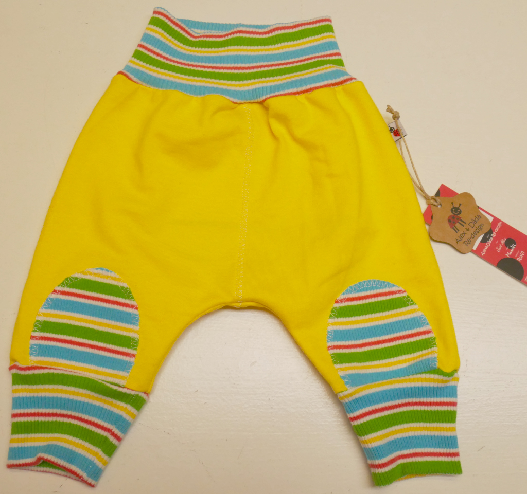 Rumpmonster, mjukisbyxa med knäpatchar fram och monsterapplikation bak av återbrukad slät ljusgul college av 100% bomull. återbrukad randig ribbstickad trikåmudd i färgerna rött/vitt/grönt/gult och turkost runt benslut, midja och som knäpatch av 100% bomull. Monsterapplikation av 100% bomull och röd tunga av WCT 100% polyester. Tvättas i 40 grader normaltvätt i maskin, ej torktumling.