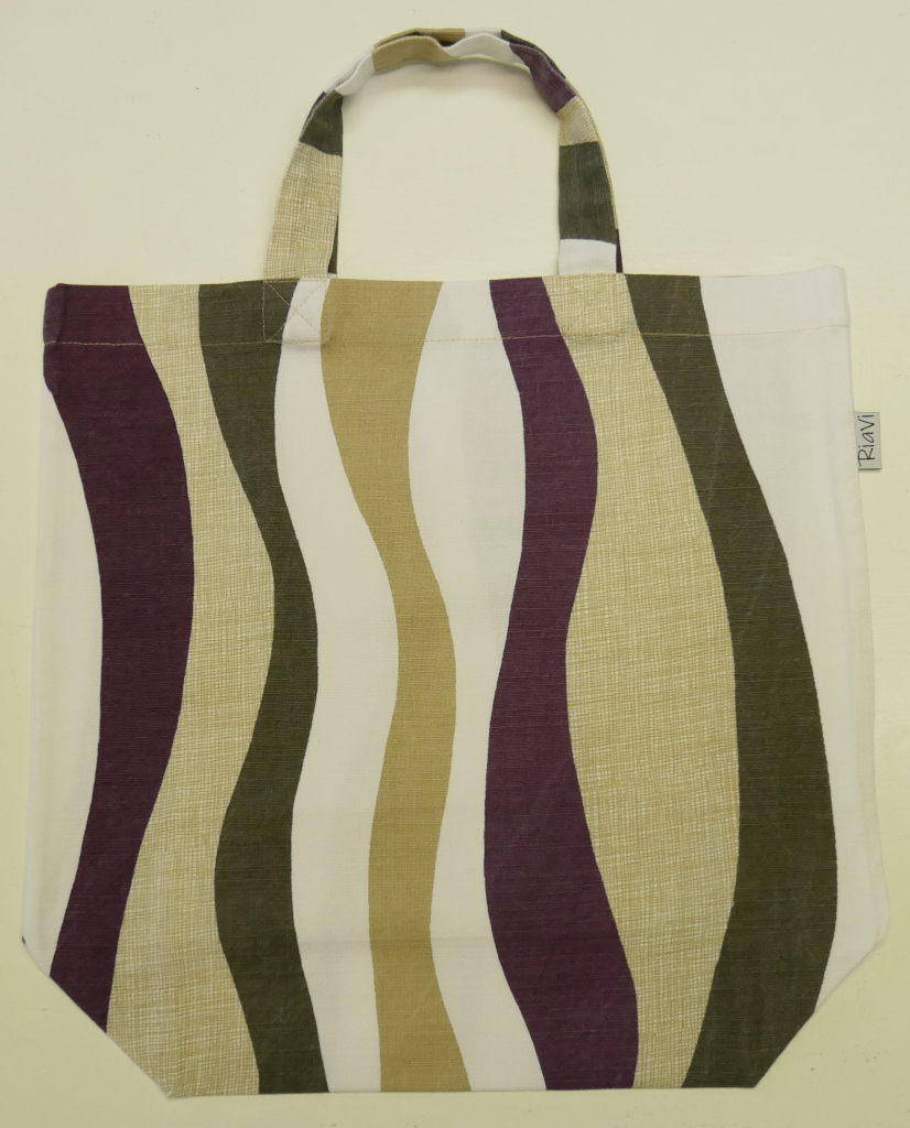 Tygväska att bära hem matvarorna i från affären t ex. Ca 42cm bredd, 41cm höjd och 14cm djup. Längd handtag 38-40cm. Återbrukad panelgardin av ett grafiskt slingmönster i färgerna creme/beige/vitt/lila och grått. Kvalité 100% bomull. Tvättas i 40 grader normaltvätt i maskin, ej torktumling.