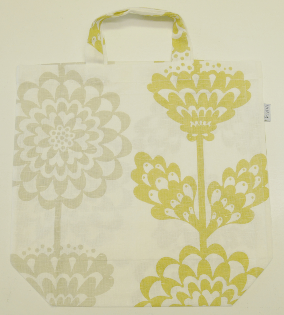 Tygväska att bära hem matvarorna i från affären t ex. Ca 43cm bredd, 41cm höjd och 14cm djup. Längd handtag 38-40cm. Återbrukad gardin av grafiskt blomtryck i grått och linblom på cremefärgad botten. Kvalité 100% bomull. Tvättas i 40 grader normaltvätt i maskin, ej torktumling.