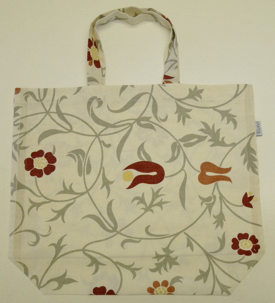 Tygväska att bära hem matvarorna i från affären t ex. Ca 49cm bredd, 41cm höjd och 14cm djup. Längd handtag 38-40cm. Återbrukad gardin av grafiskt tryck av blomsterslingor i grått/rostrött på beige botten. Kvalité 100% bomull. Tvättas i 40 grader normaltvätt i maskin, ej torktumling.