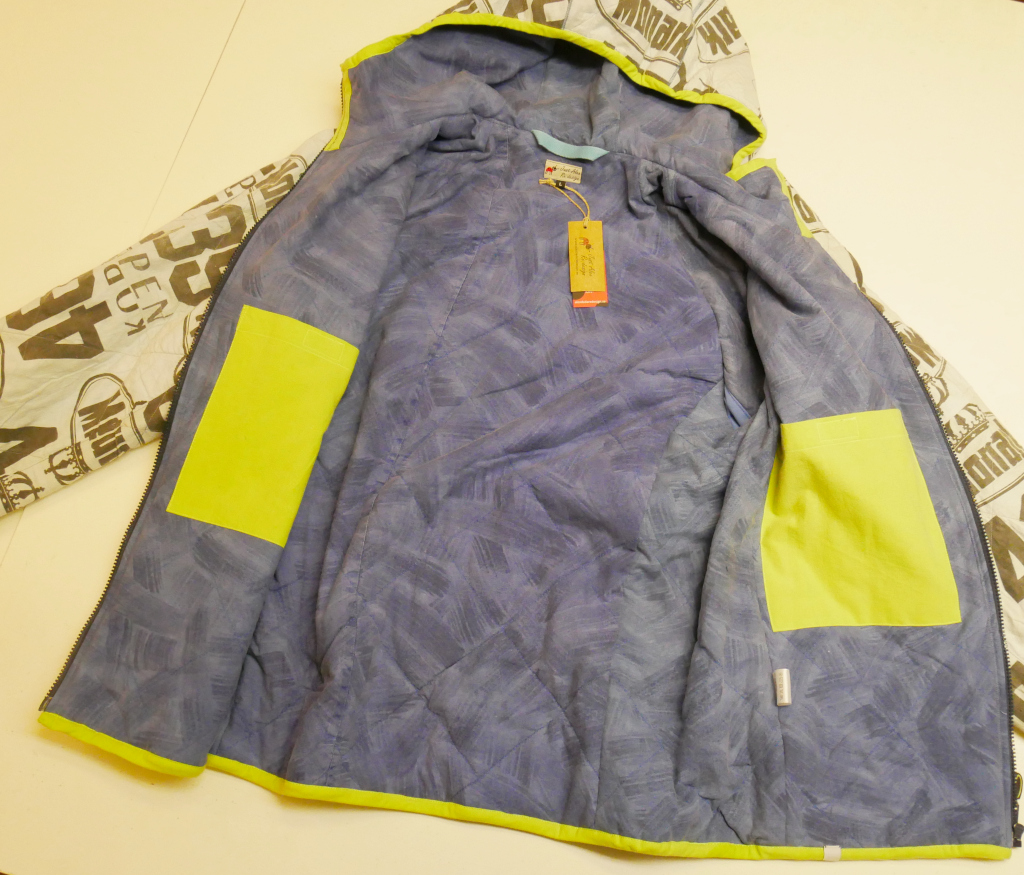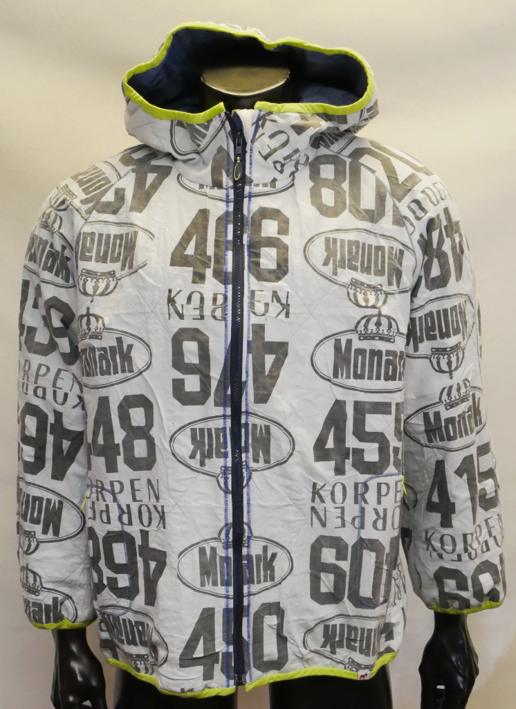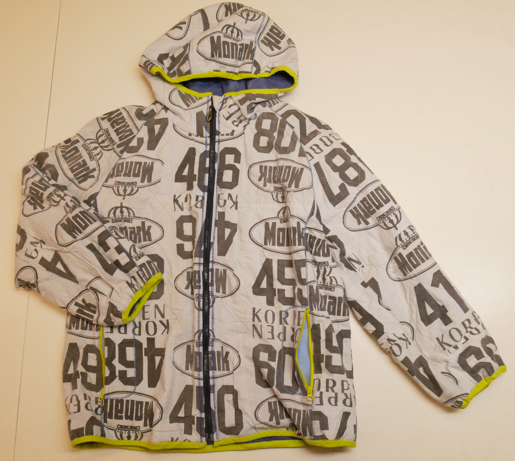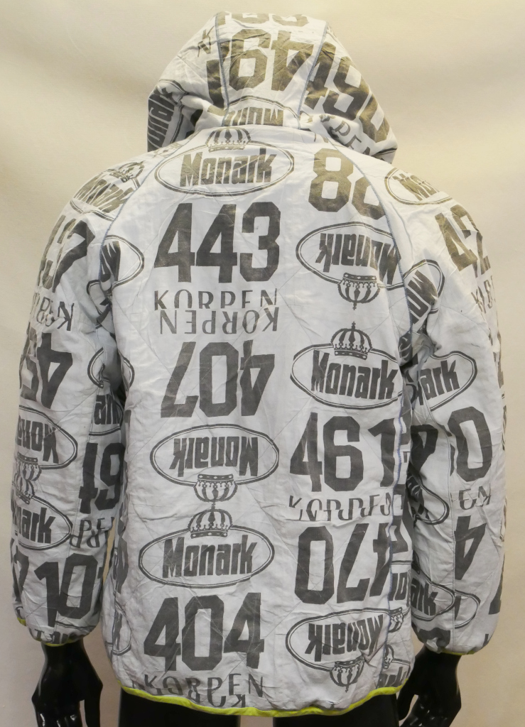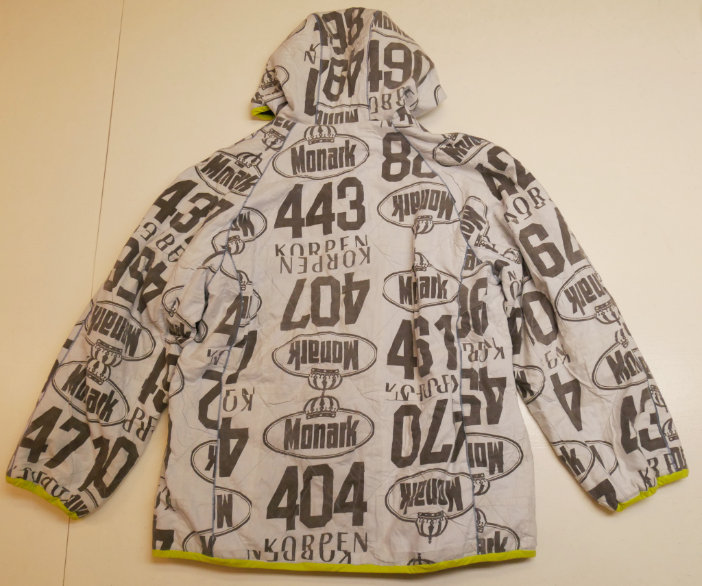 Varmfodrad jacka med fast huva, blixtlås, två sidfickor med blixtlås, två innerfickor och kantad med resårsnedslå runt huvkant, ärmslut och jackans nederkant. Material består av idrottsnummerlappar som sprättats och trycket har urlakats och tonats till en svag indigoblå nyans, 100% bomull. Dessa har quilats fast med en ljusblå bomullstextil i 100% bomull. Blåmelerat qulitat foder i 100% bomull och polyestervadd i 100% polyester. Limegrön snedslå, 100% bomull och envägs blixtlås i akryl. Tvättas i maskin, normaltvätt, 30 grader. Ej torktumling.