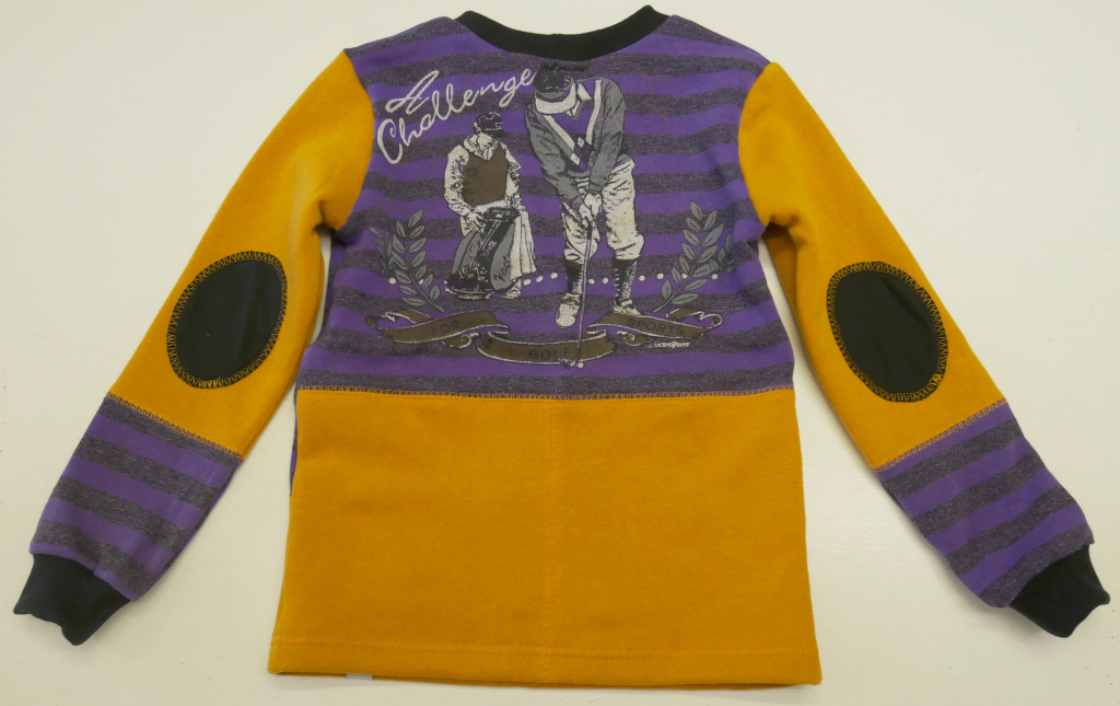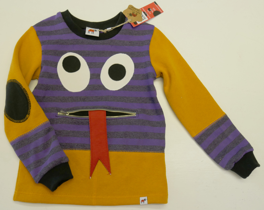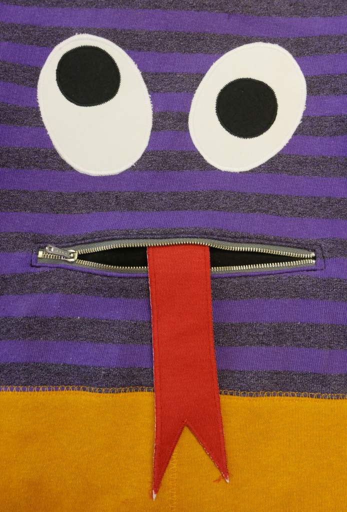 Zipmonstertröja, långärmad tröja med ärmpatchar, knasiga ögon och en blixtlåsficka med gömd tunga fram. Material av flera olika collegetextilier som randig i lila- och grå-/svartmelerad slätstickad, lejongul slätstickad och enfärgad lila med tryck bak, alla i 50% bomull och 50% polyester. Fickpåse och ärmpatchar av svart slätstickad trikå, 100% bomull. Hals-/ärmmuddar av ribbstickad svart trikå, 100% bomull. Applikation, 100% bomull. Metallzip. Allt material är återbruk från andra kläder. Tvättas i 40 grader normaltvätt i maskin, ej torktumling.