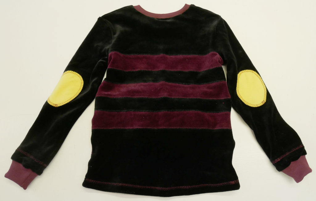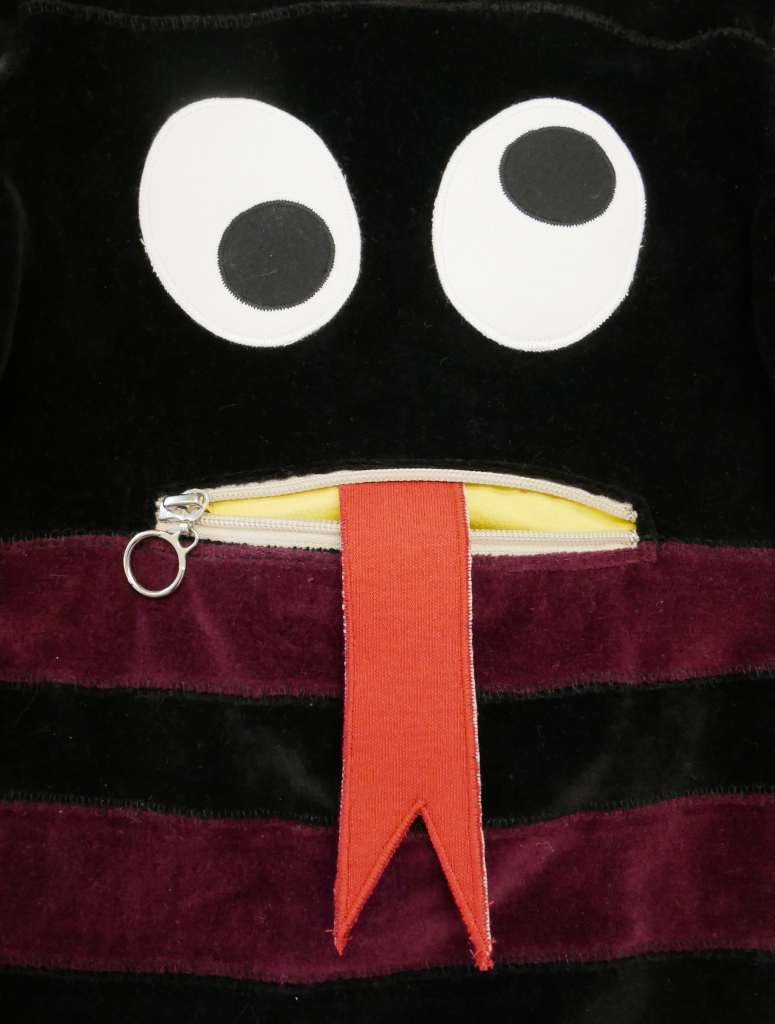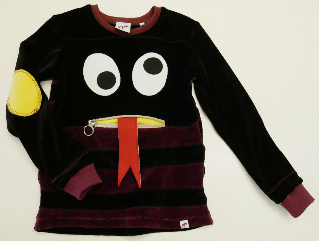 Zipmonstertröja, långärmad tröja med ärmpatchar, knasiga ögon och en blixtlåsficka med gömd tunga fram. Material av flera olika textilier i plysch som enfärgad svart och plommonfärgad, alla i 80% bomull och 20% polyester. Fickpåse och ärmpatchar av gul slätstickad trikå, 100% bomull. Hals-/ärmmuddar av ribbstickad plommonfägad trikå, 100% bomull. Applikation, 100% bomull. Plastzip. Allt material är återbruk från andra kläder. Tvättas i 40 grader normaltvätt i maskin, ej torktumling.