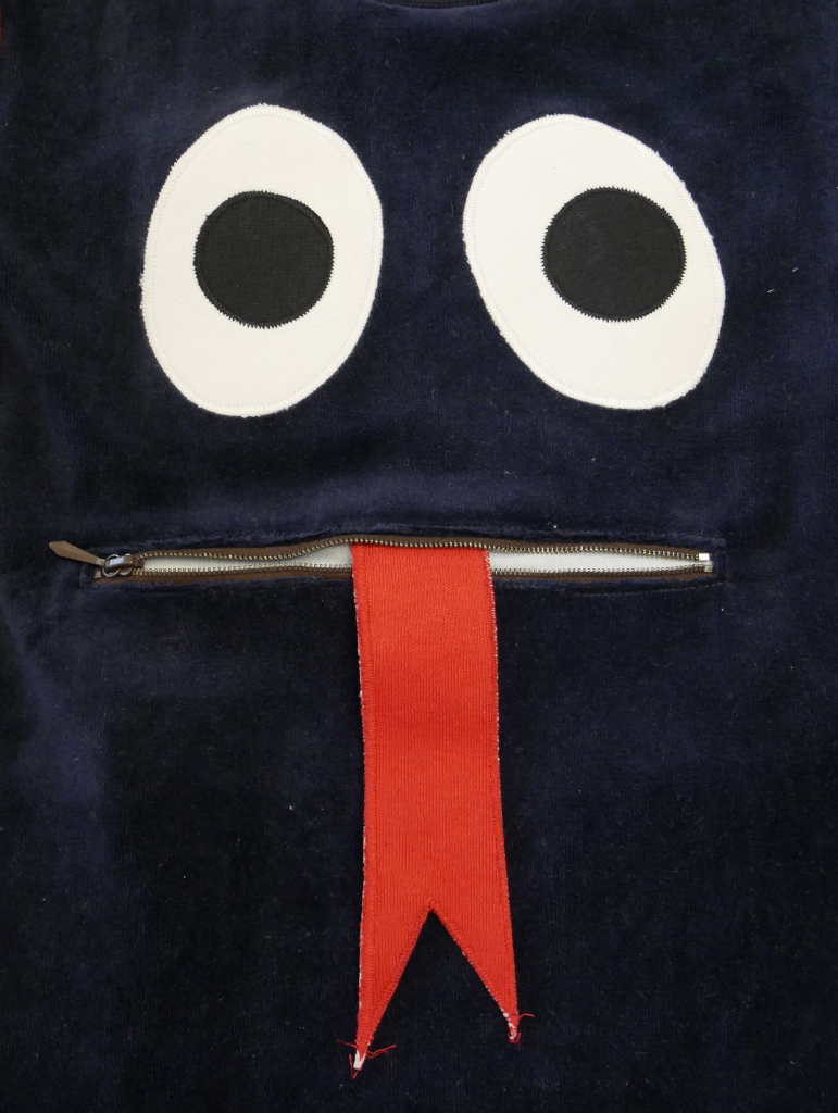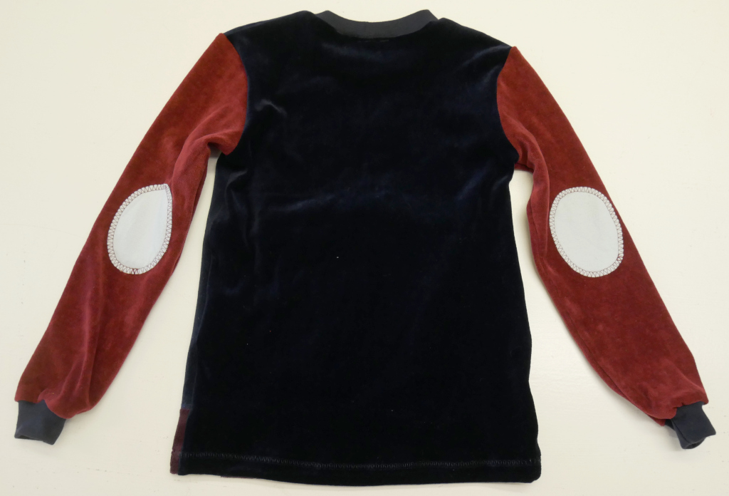 Zipmonstertröja, långärmad tröja med ärmpatchar, knasiga ögon och en blixtlåsficka med gömd tunga fram. Material av flera olika textilier i plysch, som marinblå, vinröd och bordeauxfärgad, alla i 80% bomull och 20% polyester. Fickpåse och ärmpatchar av ljusblå slätstickad trikå, 100% bomull. Hals-/ärmmuddar av ribbstickad marinblå trikå, 100% bomull. Applikation, 100% bomull. Metallzip. Allt material är återbruk från andra kläder. Tvättas i 40 grader normaltvätt i maskin, ej torktumling.