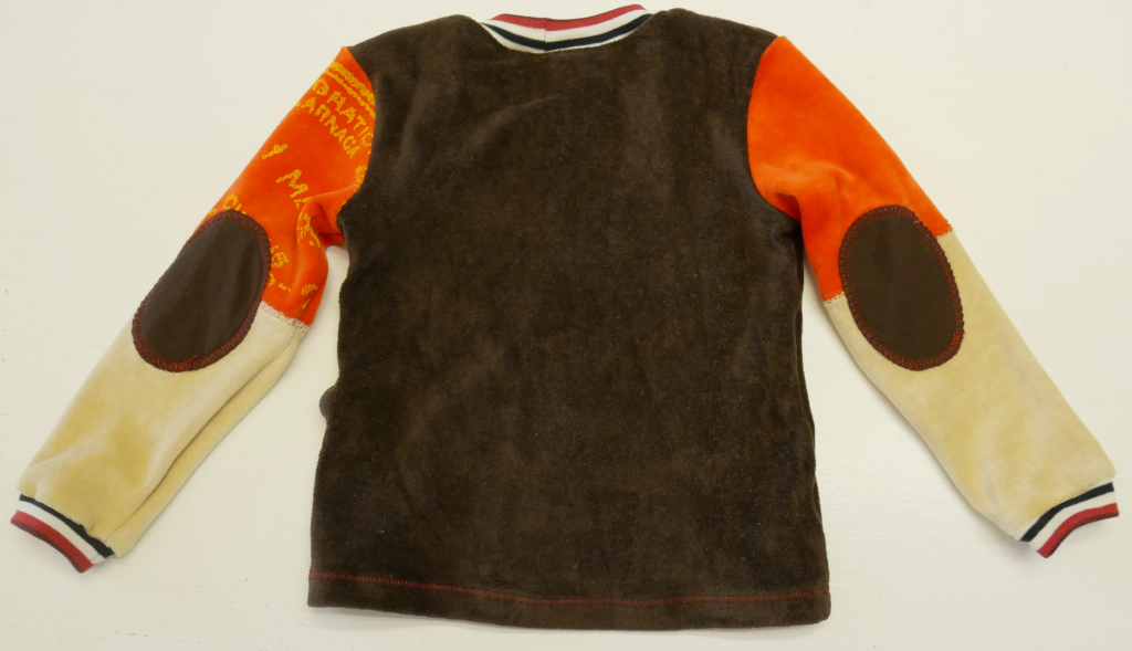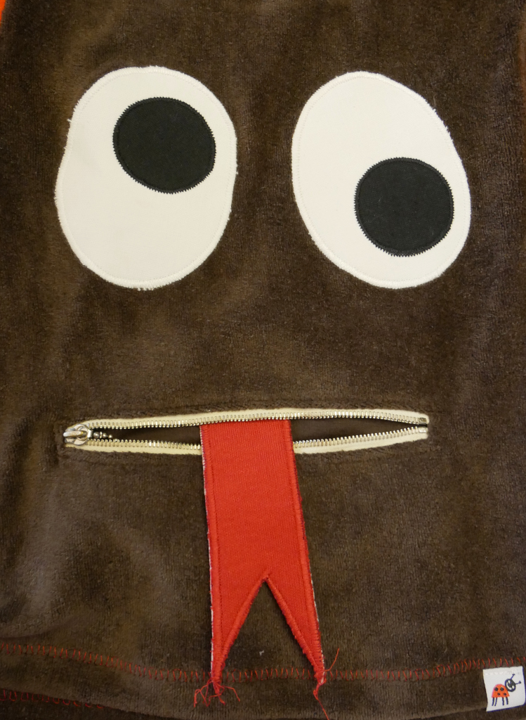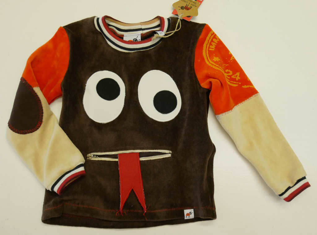 Zipmonstertröja, långärmad tröja med ärmpatchar, knasiga ögon och en blixtlåsficka med gömd tunga fram. Material av flera olika textilier i plysch, som korallröd med tryck, enfärgad beige och enfärgad brun, alla i 80% bomull och 20% polyester. Fickpåse och ärmpatchar av brun slätstickad trikå, 100% bomull. Hals-/ärmmuddar av ribbstickad randig trikå i offwhite, svart och mörkröd 100% bomull. Applikation, 100% bomull. Metallzip. Allt material är återbruk från andra kläder. Tvättas i 40 grader normaltvätt i maskin, ej torktumling.