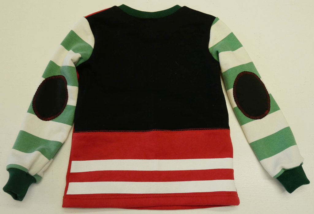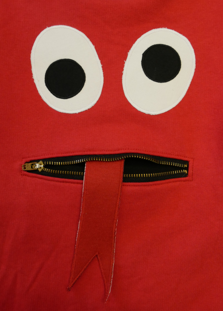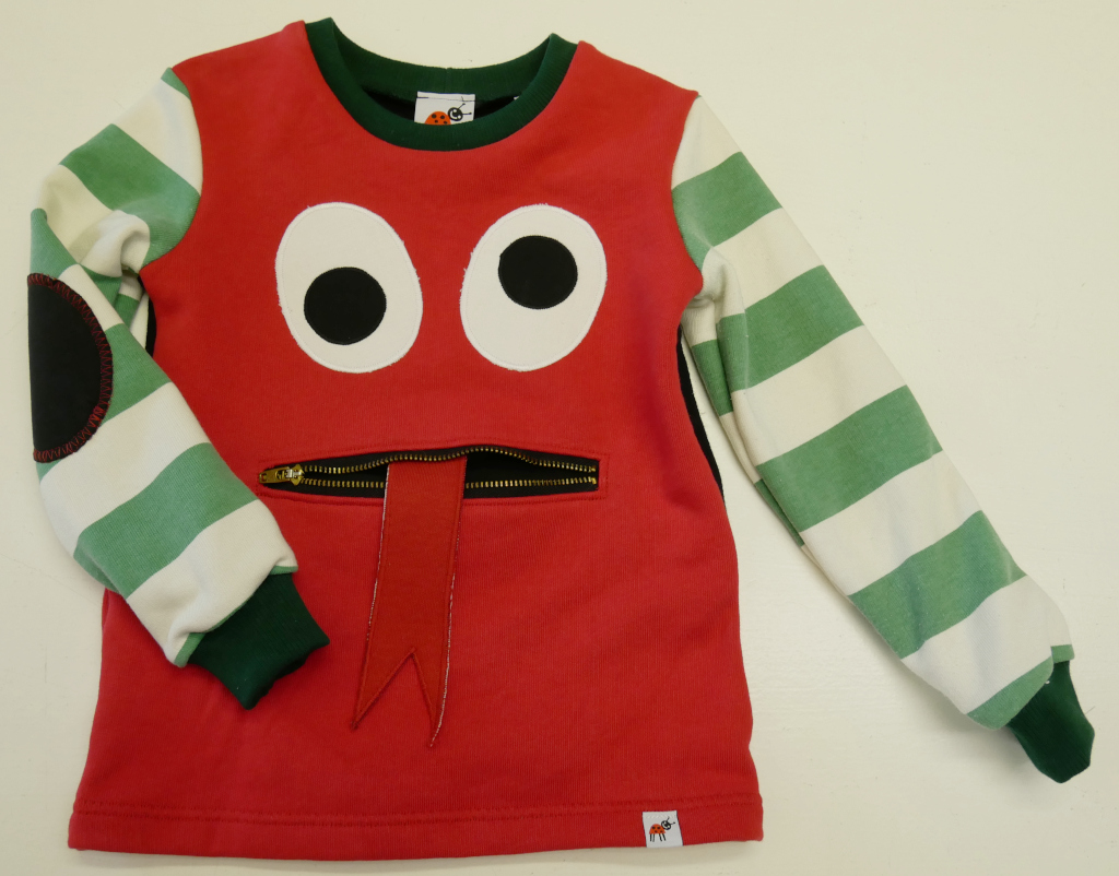 Zipmonstertröja, långärmad tröja med ärmpatchar, knasiga ögon och en blixtlåsficka med gömd tunga fram. Material av flera olika collegetextilier som enfärgad röd slätstickad, enfärgad svart slätstickad, röd med tryckta vita ränder och grön- och vitrandig slätstickad alla i 100% bomull. Fickpåse och ärmpatchar av svart slätstickad trikå, 100% bomull. Hals-/ärmmuddar av ribbstickad mörkgrön trikå, 100% bomull. Applikation, 100% bomull. Metallzip. Allt material är återbruk från andra kläder. Tvättas i 40 grader normaltvätt i maskin, ej torktumling.