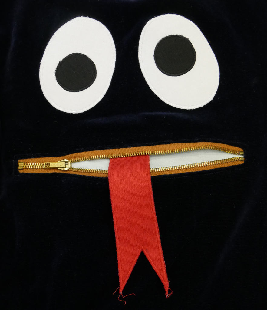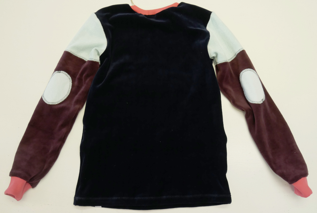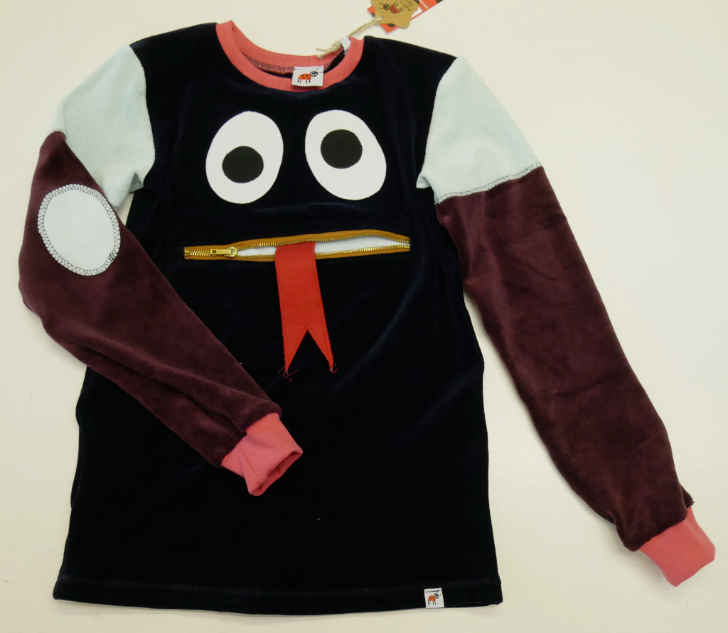 Zipmonstertröja, långärmad tröja med ärmpatchar, knasiga ögon och en blixtlåsficka med gömd tunga fram. Material av flera olika textilier i plysch, som enfärgad marinblå, enfärgad ljus turkos och enfärgad bordeauxfärgad, alla i 80% bomull och 20% polyester. Fickpåse och ärmpatchar av ljusblå slätstickad trikå, 100% bomull. Hals-/ärmmuddar av ribbstickad rosa trikå, 100% bomull. Applikation, 100% bomull. Metallzip. Allt material är återbruk från andra kläder. Tvättas i 40 grader normaltvätt i maskin, ej torktumling.