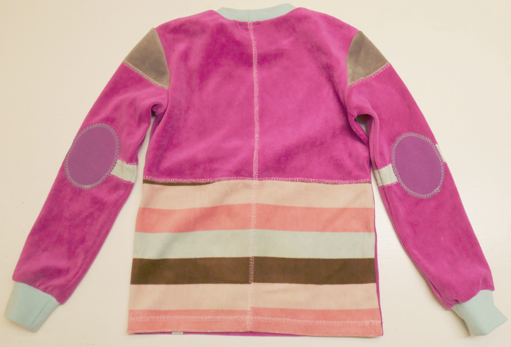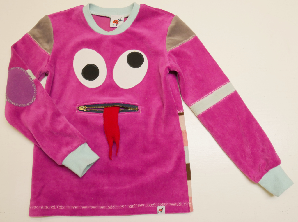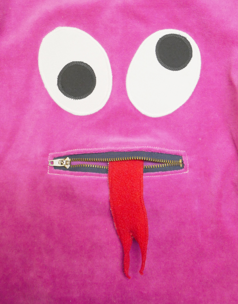 Zipmonstertröja, långärmad tröja med ärmpatchar, knasiga ögon och en blixtlåsficka med gömd tunga fram. Material av flera olika enfärgade plyschtextilier i färgerna ceriserosa/ljusgrått och mullvad i 80% bomull och 20% polyester, också pastellrandig plysch i 80% bomull och 20% polyester. Fickpåse och ärmpatchar av lila slätstickad trikå, 100% bomull. Hals-/ärmmuddar av ribbstickad mintgrön trikå, 100% bomull. Ögonapplikation, 100% bomull och tunga, 100% polyester. Metallzip. Allt material är återbruk från andra kläder. Tvättas i 40 grader normaltvätt i maskin, ej torktumling.