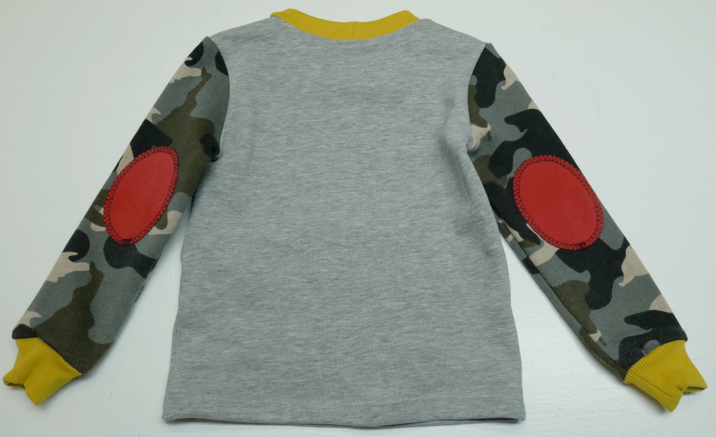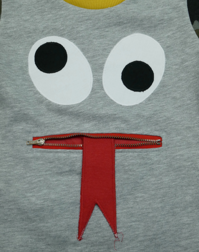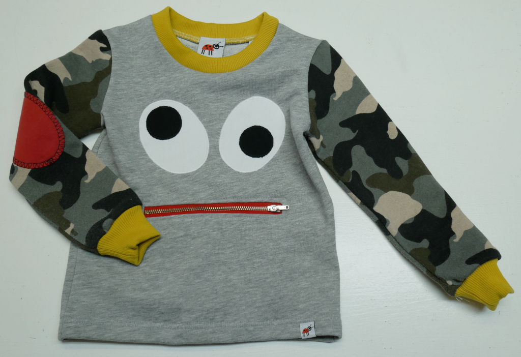 Zipmonstertröja, långärmad tröja med ärmpatchar, knasiga ögon och en blixtlåsficka med gömd tunga fram. Material av flera olika collegetextilier som ljusgrå melange slätstickad, 80% bomull och 20% polyester, kamoflagemönstrad slätstickad college, 100% bomull. Fickpåse och ärmpatchar av röd slätstickad trikå, 100% bomull. Hals-/ärmmuddar av ribbstickad gul trikå, 100% bomull. Applikation, 100% bomull. Metallzip. Allt material är återbruk från andra kläder. Tvättas i 40 grader normaltvätt i maskin, ej torktumling.