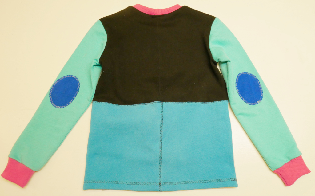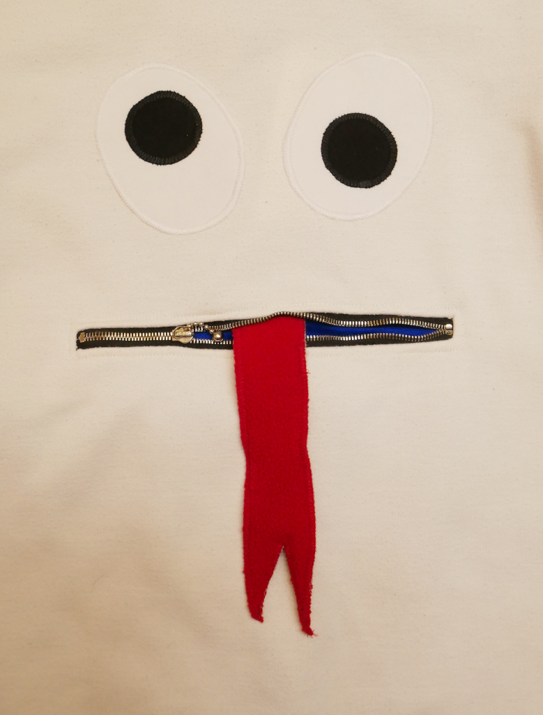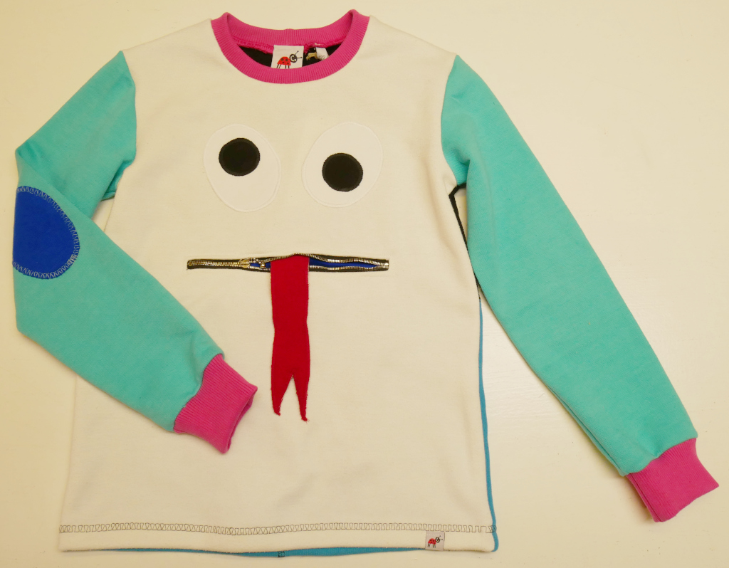 Zipmonstertröja, långärmad tröja med ärmpatchar, knasiga ögon och en blixtlåsficka med gömd tunga fram. Material av flera olika enfärgade collegetextilier i färgerna vitt och svart av 100% bomull, mellanblå college i 65% bomull och 35% polyester och pistagegrön college i, 100% bomull.  Fickpåse och ärmpatchar av kornblå slätstickad trikå, 100% bomull. Hals-/ärmmuddar av ribbstickad rosa trikå, 100% bomull. Ögonapplikation, 100% bomull och tunga, 100% polyester. Metallzip. Allt material är återbruk från andra kläder. Tvättas i 40 grader normaltvätt i maskin, ej torktumling.