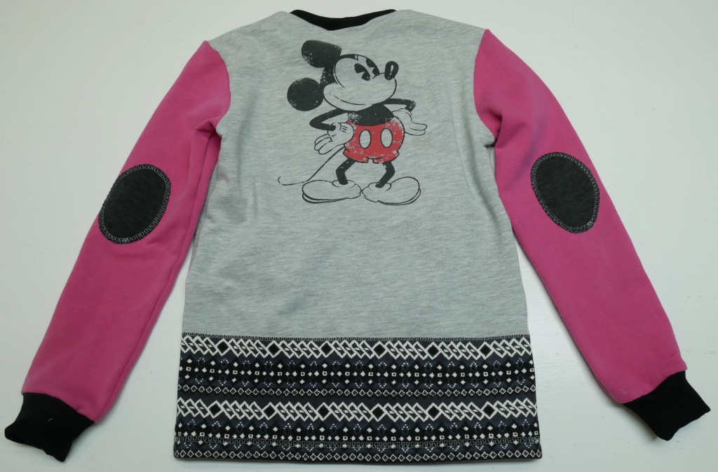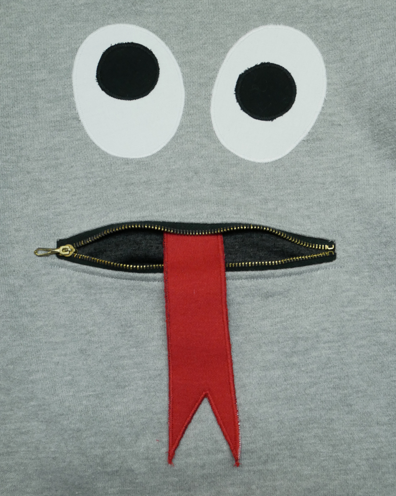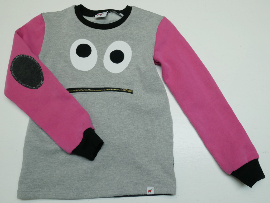 Zipmonstertröja, långärmad tröja med ärmpatchar, knasiga ögon och en blixtlåsficka med gömd tunga fram. Material av flera olika collegetextilier som gråmelange med tryck bak, ceriserosa och en bårdmönstrad i svart/grått och vitt, alla i slätstickad, 80% bomull och 20% polyester. Fickpåse och ärmpatchar av mörkgrå slätstickad trikå, 100% bomull. Hals-/ärmmuddar av ribbstickad svart trikå, 100% bomull. Applikation, 100% bomull. Metallzip. Allt material är återbruk från andra kläder. Tvättas i 40 grader normaltvätt i maskin, ej torktumling.