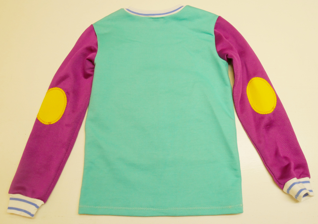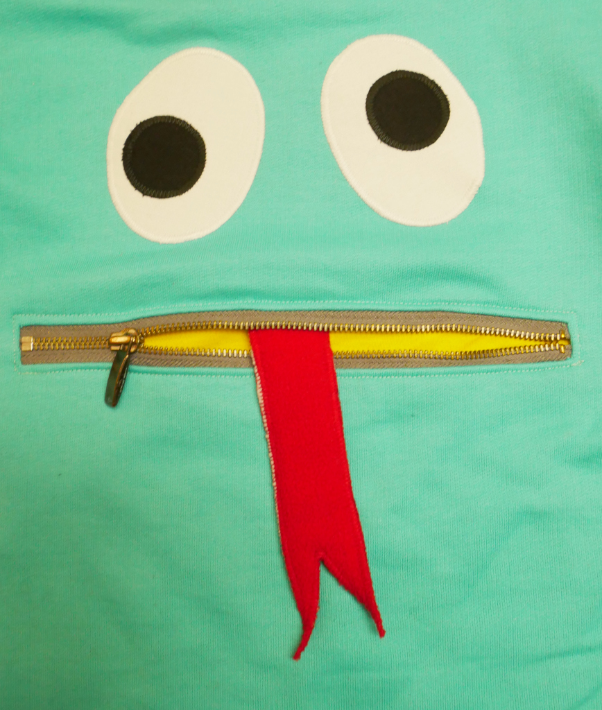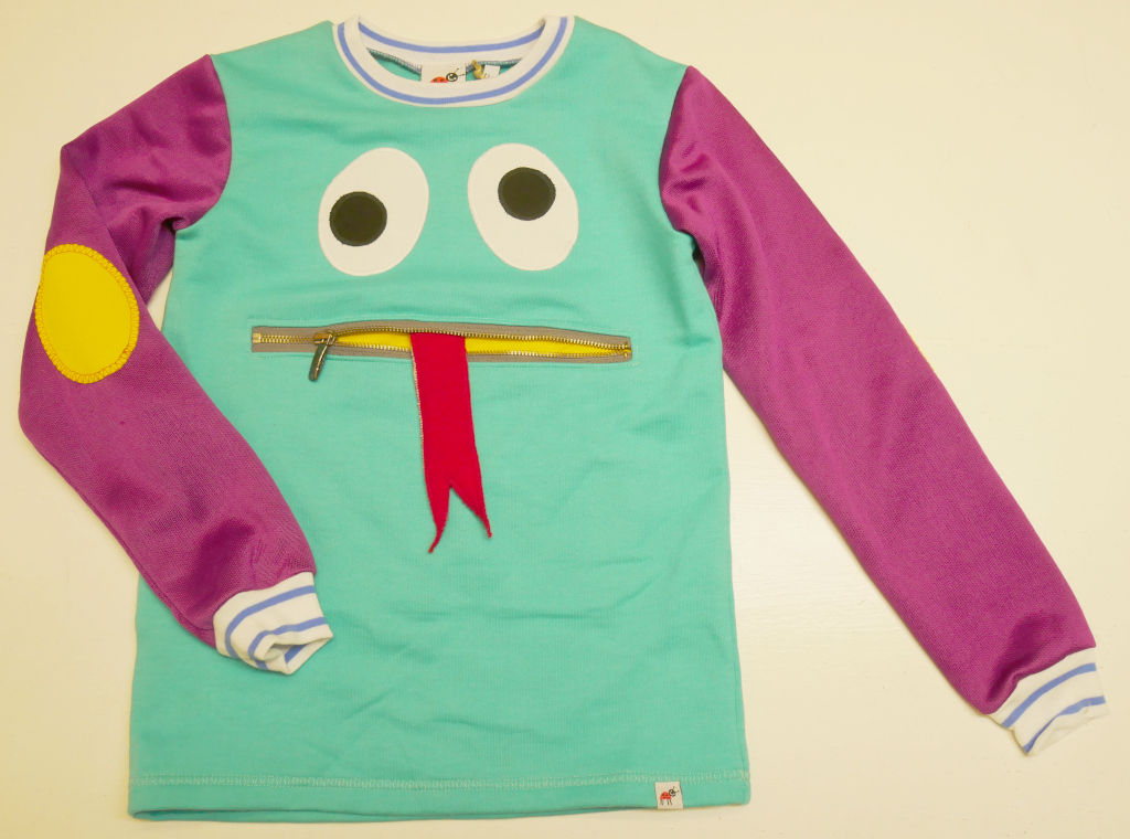 Zipmonstertröja, långärmad tröja med ärmpatchar, knasiga ögon och en blixtlåsficka med gömd tunga fram. Material av pistagegrön slätstickad college i 100% bomull, och fuschiafärgad WCT i 100% polyester.  Fickpåse och ärmpatchar av gul slätstickad trikå, 100% bomull. Hals-/ärmmuddar av vit- och blårandig ribbstickad trikå, 100% bomull. Ögonapplikation, 100% bomull och tunga, 100% polyester. Metallzip. Allt material är återbruk från andra kläder. Tvättas i 40 grader normaltvätt i maskin, ej torktumling.